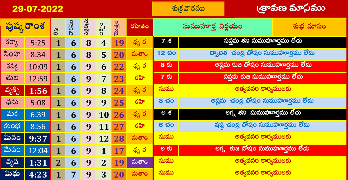 ఈ రోజు ముహూర్తాలు (29-7-2022) శ్రావణమాసము జూలై 29, 2022 తేదీ (పుష్కరాంశ, లగ్నం, రహితం) శుభ ముహూర్త సమయాల కోసం పైన పట్టికలో చూడండి.