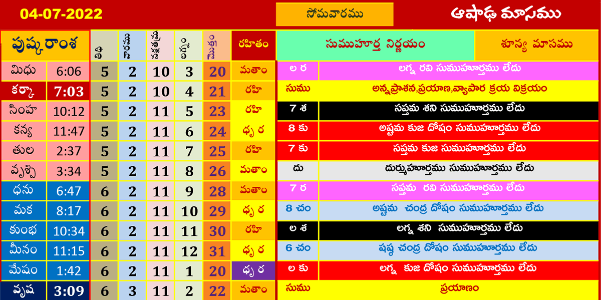 ఈ రోజు ముహూర్తాలు (4-7-2022) ఆషాఢమాసము జూలై 4, 2022 తేదీ (పుష్కరాంశ, లగ్నం, రహితం) శుభ ముహూర్త సమయాల కోసం పైన పట్టికలో చూడండి.