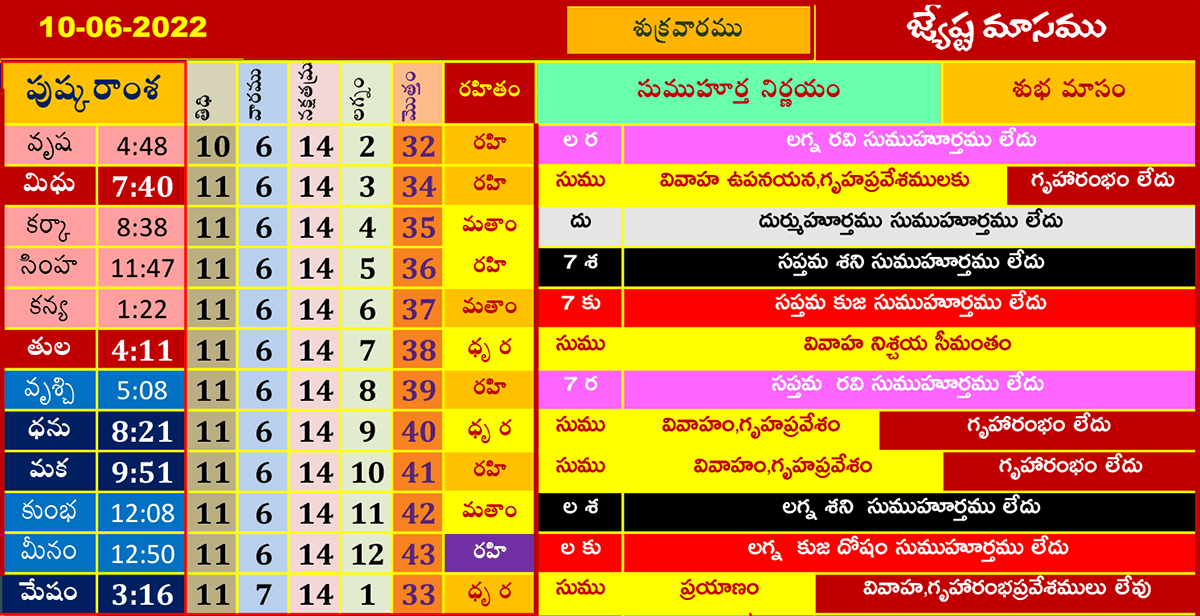 ఈ రోజు ముహూర్తాలు (10-6-2022) జ్యేష్ఠమాసము జూన్ 10, 2022 తేదీ (పుష్కరాంశ, లగ్నం, రహితం) శుభ ముహూర్త సమయాల కోసం పైన పట్టికలో చూడండి.