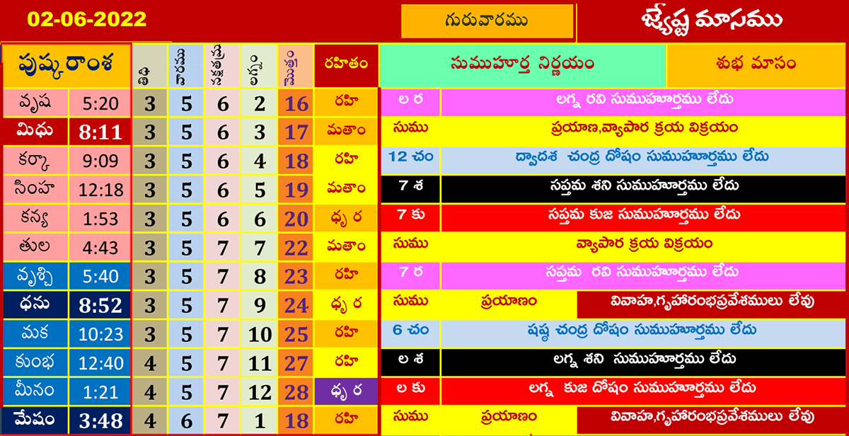 ఈ రోజు ముహూర్తాలు (2-6-2022) జ్యేష్ఠమాసము జూన్ 2, 2022 తేదీ (పుష్కరాంశ, లగ్నం, రహితం) శుభ ముహూర్త సమయాల కోసం పైన పట్టికలో చూడండి.