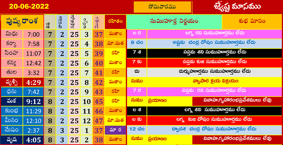 ఈ రోజు ముహూర్తాలు (20-6-2022) జ్యేష్ఠమాసము జూన్ 20, 2022 తేదీ (పుష్కరాంశ, లగ్నం, రహితం) శుభ ముహూర్త సమయాల కోసం పైన పట్టికలో చూడండి.