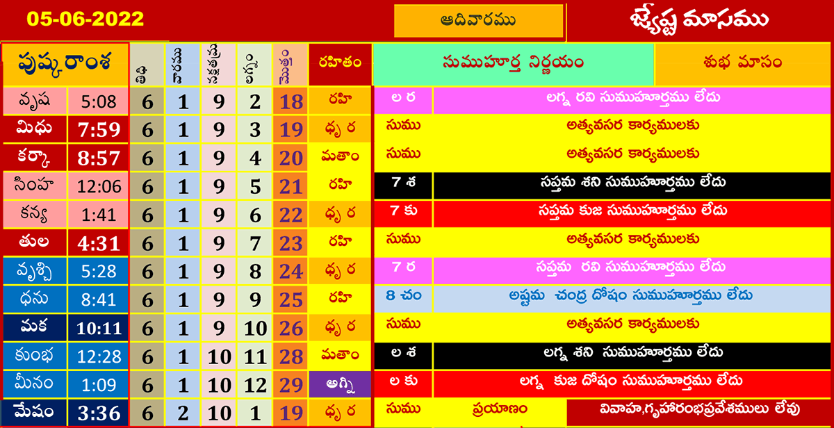 ఈ రోజు ముహూర్తాలు (5-6-2022) జ్యేష్ఠమాసము జూన్ 5, 2022 తేదీ (పుష్కరాంశ, లగ్నం, రహితం) శుభ ముహూర్త సమయాల కోసం పైన పట్టికలో చూడండి.