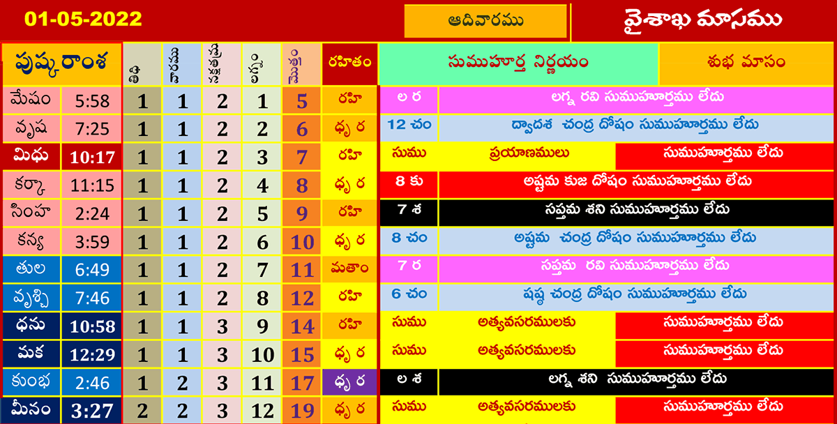 ఈ రోజు ముహూర్తాలు (1-5-2022) వైశాఖమాసము మే 1, 2022 తేదీ (పుష్కరాంశ, లగ్నం, రహితం) శుభ ముహూర్త సమయాల కోసం పైన పట్టికలో చూడండి.