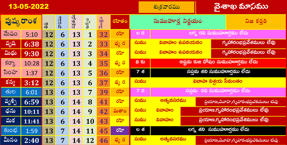 ఈ రోజు ముహూర్తాలు (13-5-2022) వైశాఖమాసము మే 13, 2022 తేదీ (పుష్కరాంశ, లగ్నం, రహితం) శుభ ముహూర్త సమయాల కోసం పైన పట్టికలో చూడండి.