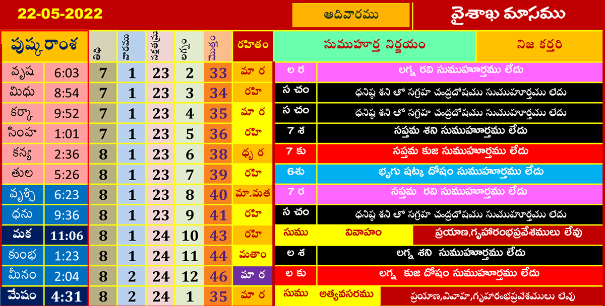 ఈ రోజు ముహూర్తాలు (22-5-2022) వైశాఖమాసము మే 22, 2022 తేదీ (పుష్కరాంశ, లగ్నం, రహితం) శుభ ముహూర్త సమయాల కోసం పైన పట్టికలో చూడండి.