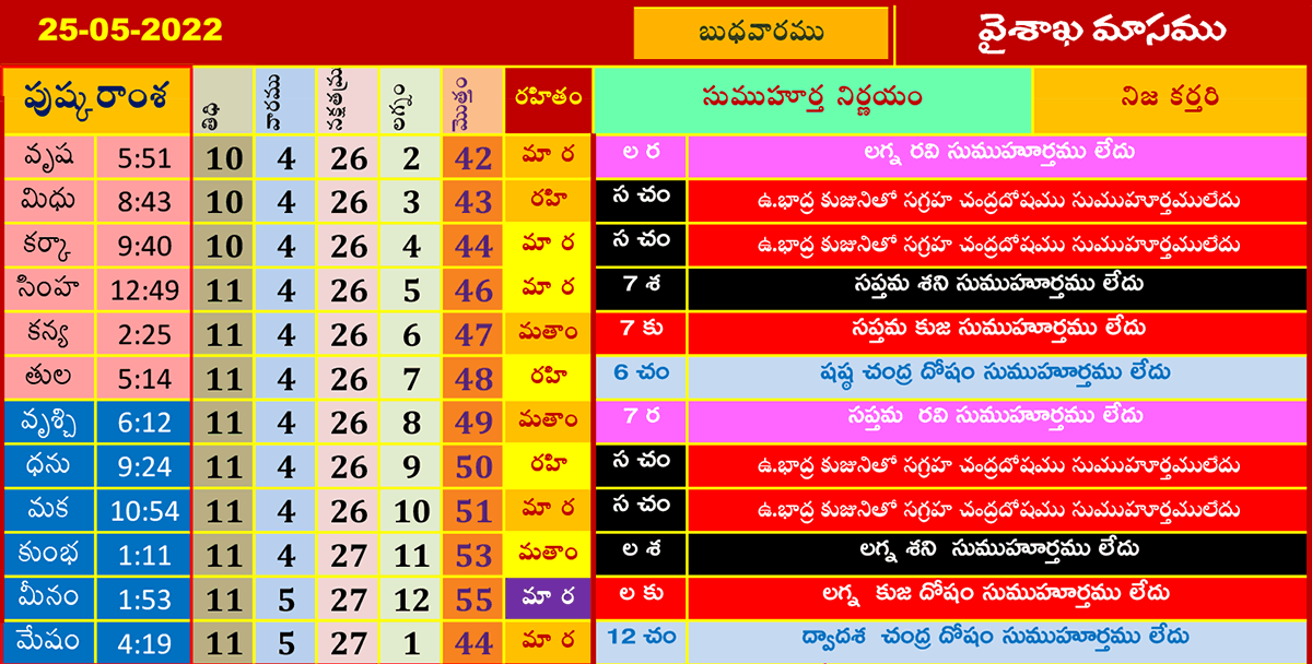 ఈ రోజు ముహూర్తాలు (25-5-2022) వైశాఖమాసము మే 25, 2022 తేదీ (పుష్కరాంశ, లగ్నం, రహితం) శుభ ముహూర్త సమయాల కోసం పైన పట్టికలో చూడండి.
