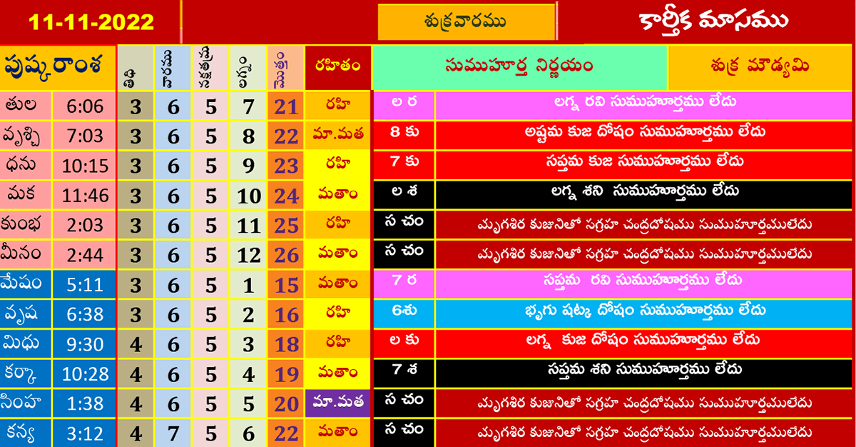 ఈ రోజు ముహూర్తాలు (11-11-2022) కార్తీకమాసము నవంబర్ 11, 2022 తేదీ (పుష్కరాంశ, లగ్నం, రహితం) శుభ ముహూర్త సమయాల కోసం పైన పట్టికలో చూడండి.