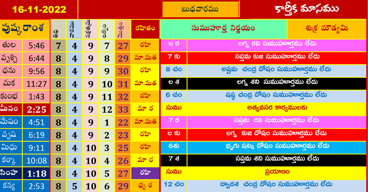 ఈ రోజు ముహూర్తాలు (16-11-2022) కార్తీకమాసము నవంబర్ 16, 2022 తేదీ (పుష్కరాంశ, లగ్నం, రహితం) శుభ ముహూర్త సమయాల కోసం పైన పట్టికలో చూడండి.