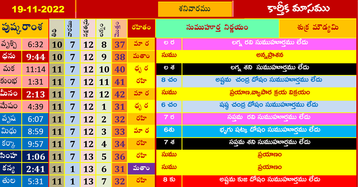 ఈ రోజు ముహూర్తాలు (19-11-2022) కార్తీకమాసము నవంబర్ 19, 2022 తేదీ (పుష్కరాంశ, లగ్నం, రహితం) శుభ ముహూర్త సమయాల కోసం పైన పట్టికలో చూడండి.