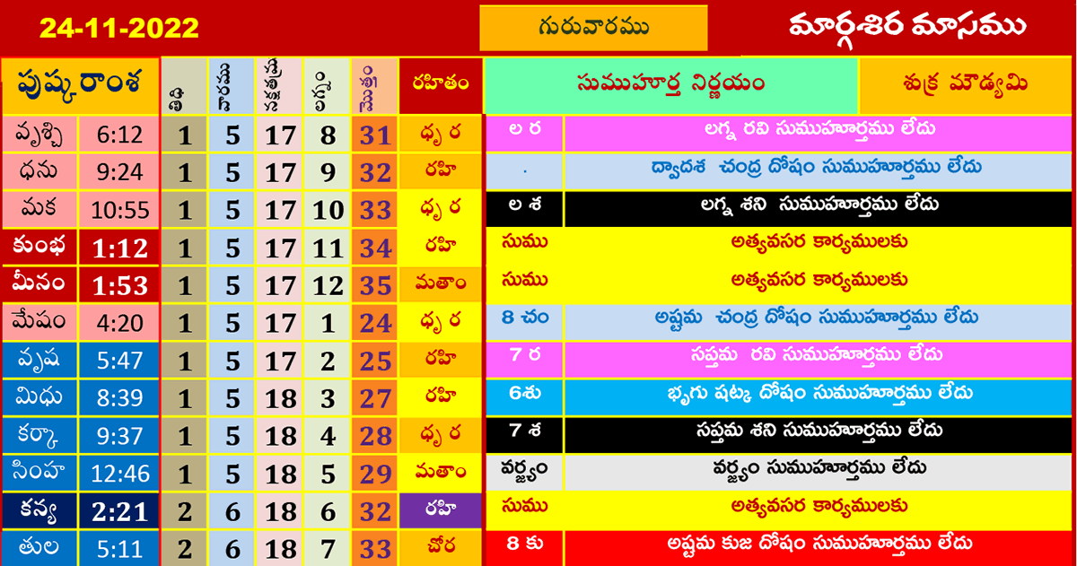 ఈ రోజు ముహూర్తాలు (24-11-2022) మార్గశిరమాసము నవంబర్ 24, 2022 తేదీ (పుష్కరాంశ, లగ్నం, రహితం) శుభ ముహూర్త సమయాల కోసం పైన పట్టికలో చూడండి.