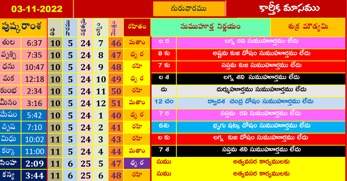 ఈ రోజు ముహూర్తాలు (3-11-2022) కార్తీకమాసము నవంబర్ 3, 2022 తేదీ (పుష్కరాంశ, లగ్నం, రహితం) శుభ ముహూర్త సమయాల కోసం పైన పట్టికలో చూడండి.