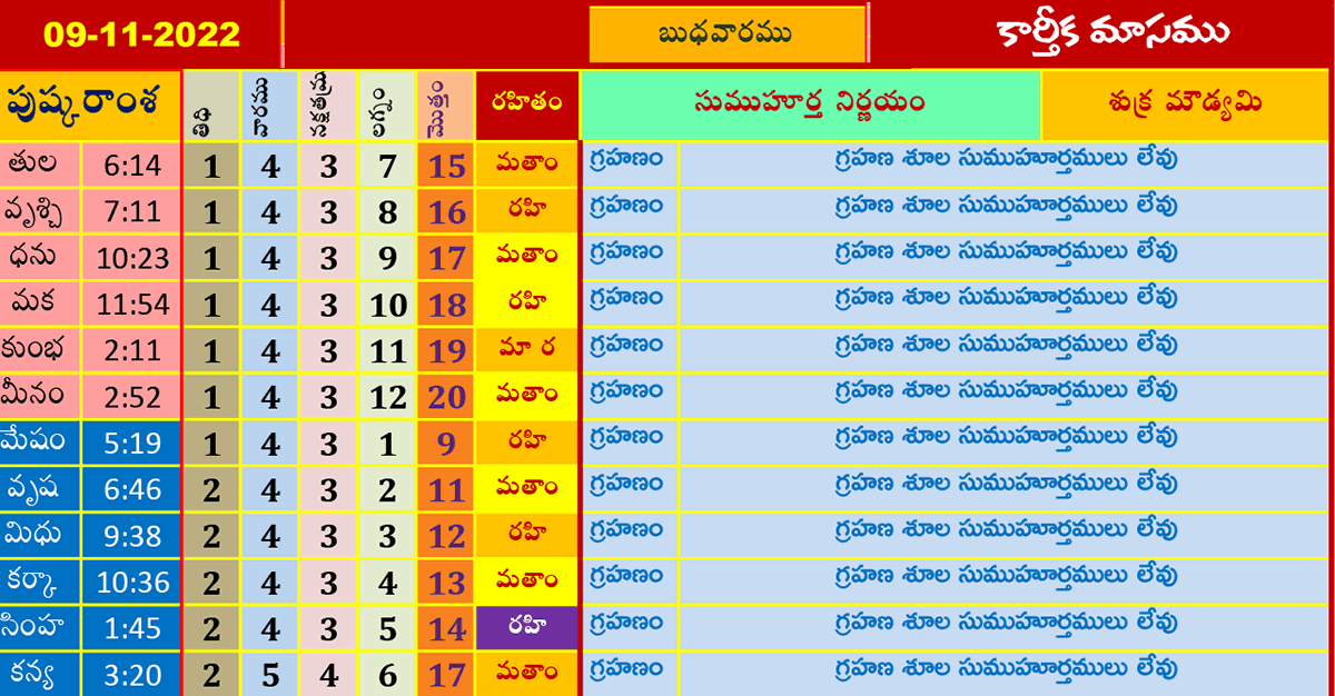 ఈ రోజు ముహూర్తాలు (9-11-2022) కార్తీకమాసము నవంబర్ 9, 2022 తేదీ (పుష్కరాంశ, లగ్నం, రహితం) శుభ ముహూర్త సమయాల కోసం పైన పట్టికలో చూడండి.