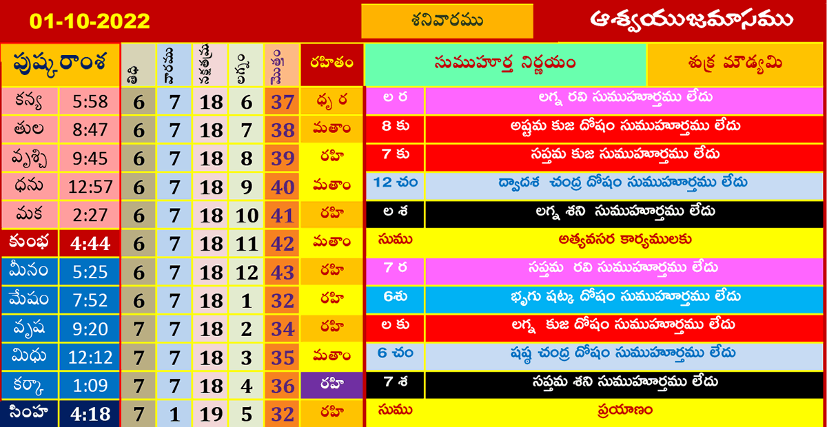 ఈ రోజు ముహూర్తాలు (1-10-2022) ఆశ్వయుజమాసము అక్టోబర్ 1, 2022 తేదీ (పుష్కరాంశ, లగ్నం, రహితం) శుభ ముహూర్త సమయాల కోసం పైన పట్టికలో చూడండి.