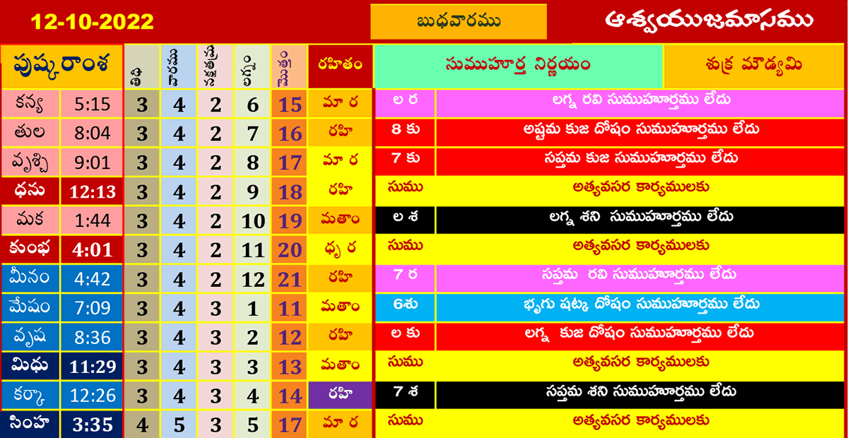 ఈ రోజు ముహూర్తాలు (12-10-2022) ఆశ్వయుజమాసము అక్టోబర్ 12, 2022 తేదీ (పుష్కరాంశ, లగ్నం, రహితం) శుభ ముహూర్త సమయాల కోసం పైన పట్టికలో చూడండి.