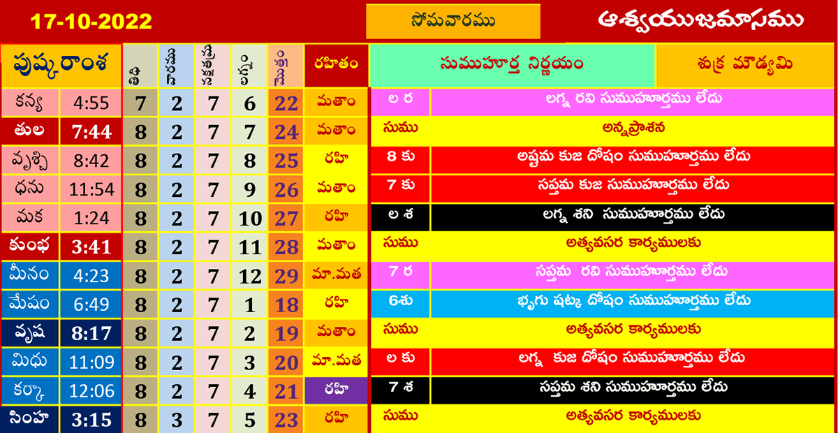 ఈ రోజు ముహూర్తాలు (17-10-2022) ఆశ్వయుజమాసము అక్టోబర్ 17, 2022 తేదీ (పుష్కరాంశ, లగ్నం, రహితం) శుభ ముహూర్త సమయాల కోసం పైన పట్టికలో చూడండి.