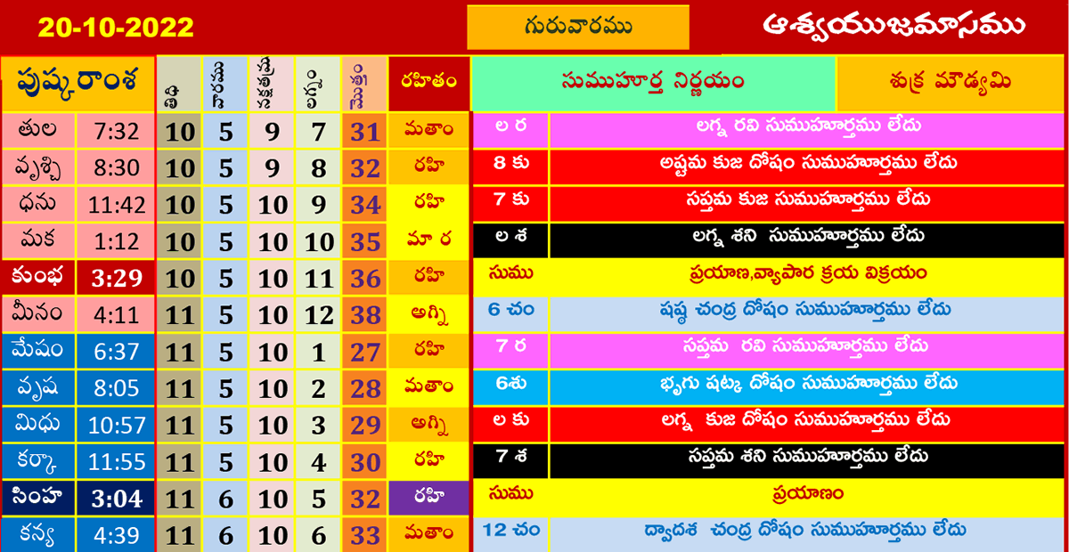 ఈ రోజు ముహూర్తాలు (20-10-2022) ఆశ్వయుజమాసము అక్టోబర్ 20, 2022 తేదీ (పుష్కరాంశ, లగ్నం, రహితం) శుభ ముహూర్త సమయాల కోసం పైన పట్టికలో చూడండి.