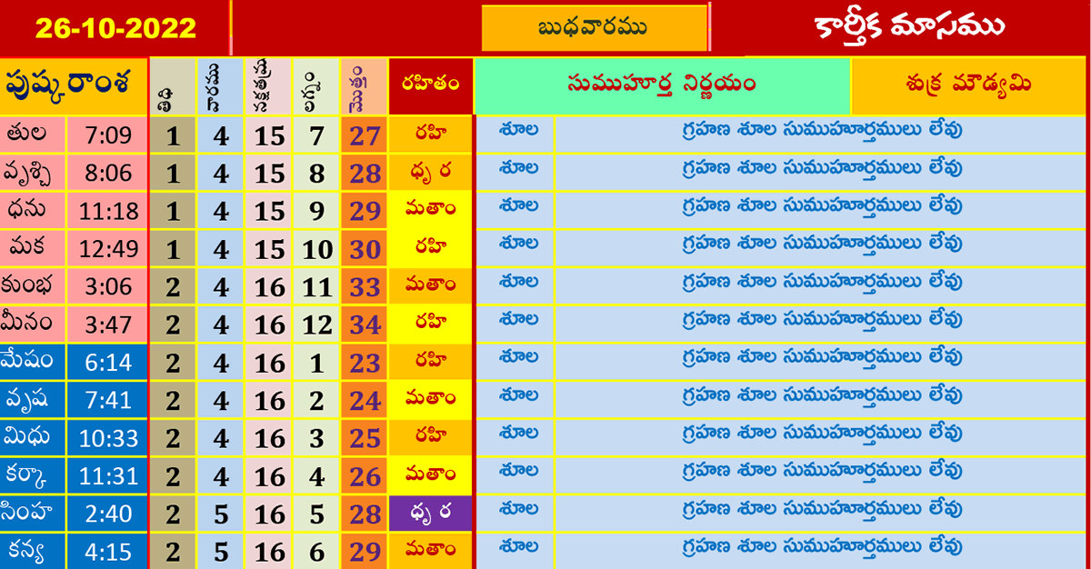 ఈ రోజు ముహూర్తాలు (26-10-2022) కార్తీకమాసము అక్టోబర్ 26, 2022 తేదీ (పుష్కరాంశ, లగ్నం, రహితం) శుభ ముహూర్త సమయాల కోసం పైన పట్టికలో చూడండి.