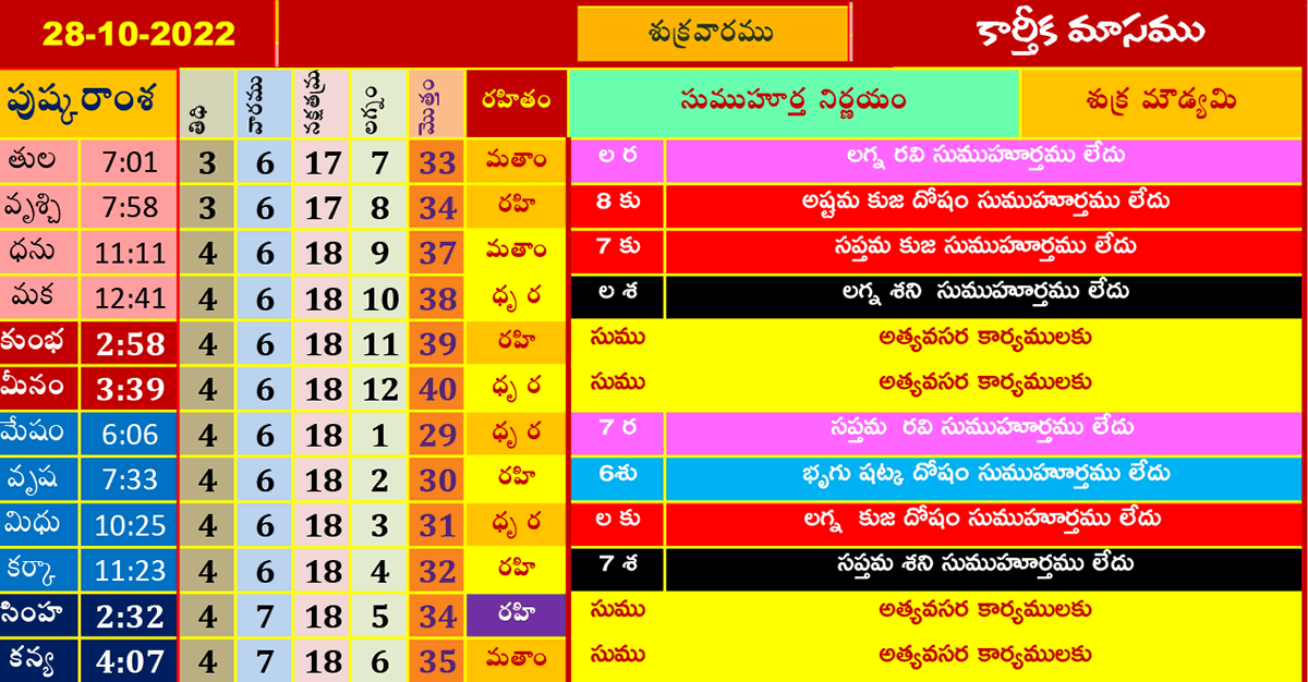 ఈ రోజు ముహూర్తాలు (28-10-2022) కార్తీకమాసము అక్టోబర్ 28, 2022 తేదీ (పుష్కరాంశ, లగ్నం, రహితం) శుభ ముహూర్త సమయాల కోసం పైన పట్టికలో చూడండి.