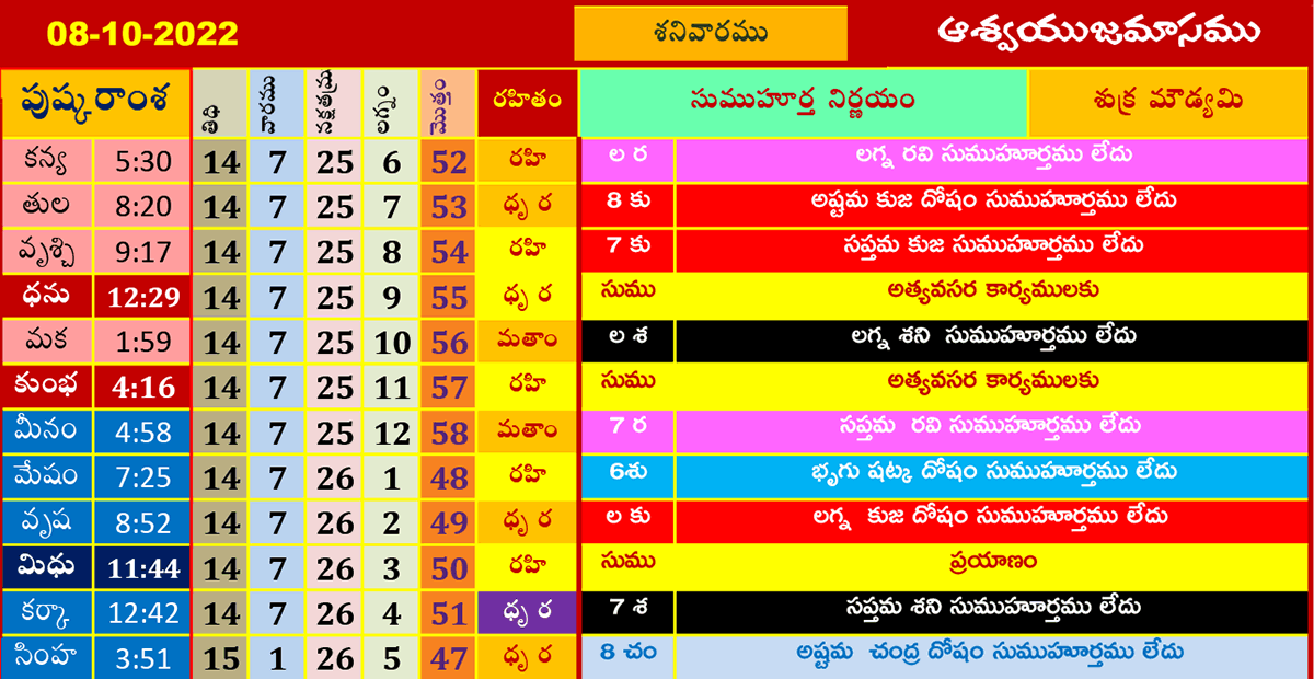 ఈ రోజు ముహూర్తాలు (8-10-2022) ఆశ్వయుజమాసము అక్టోబర్ 8, 2022 తేదీ (పుష్కరాంశ, లగ్నం, రహితం) శుభ ముహూర్త సమయాల కోసం పైన పట్టికలో చూడండి.