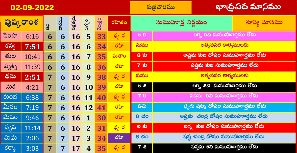 ఈ రోజు ముహూర్తాలు (2-9-2022) బాధ్రపదమాసము సెప్టెంబర్ 2, 2022 తేదీ (పుష్కరాంశ, లగ్నం, రహితం) శుభ ముహూర్త సమయాల కోసం పైన పట్టికలో చూడండి.