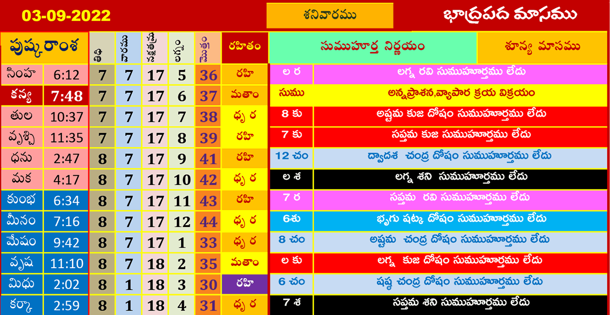 ఈ రోజు ముహూర్తాలు (3-9-2022) బాధ్రపదమాసము సెప్టెంబర్ 3, 2022 తేదీ (పుష్కరాంశ, లగ్నం, రహితం) శుభ ముహూర్త సమయాల కోసం పైన పట్టికలో చూడండి.
