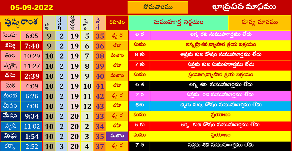 ఈ రోజు ముహూర్తాలు (5-9-2022) బాధ్రపదమాసము సెప్టెంబర్ 5, 2022 తేదీ (పుష్కరాంశ, లగ్నం, రహితం) శుభ ముహూర్త సమయాల కోసం పైన పట్టికలో చూడండి.