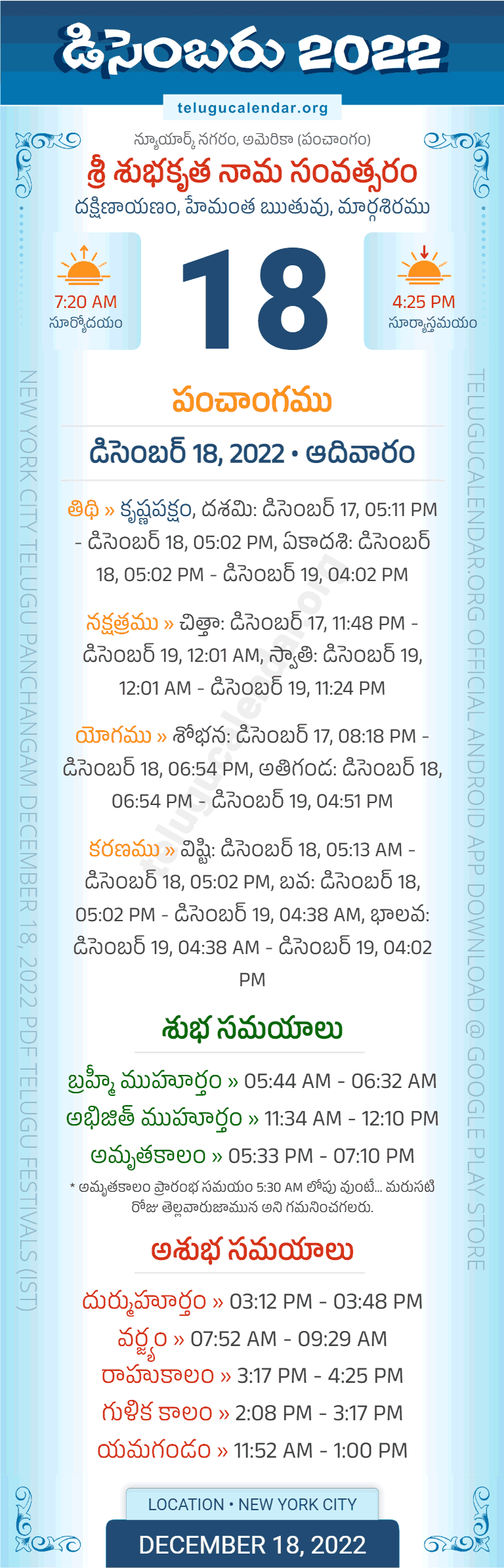 December 18, 2022 Subha Muhurthalu (IST)Telugu Panchangam 2022 Daily Calendar Sheet for New York (USA) showing information about the 5 attributes of the day, viz., Nakshatram, Tithi, Varam, Yogam & Karanam along with starting and end timings. Apart from the Panchangam, you can also find the Sunrise and Sunset timings, Paksham, Telugu Year, Yanam, Rutuvu, Telugu Month for New York. Auspicious Period 18 December 2022 New York (Today Good Timings like Abhijit Muhurtham, Amruta Kalam & Brahma Muhurtham) and Inauspicious Period 18 December 2022 New York (Bad Timings like Rahukalam, Gulika kalam, Yamagandam, Durmuhurtham & Varjyam) with starting and end timings.