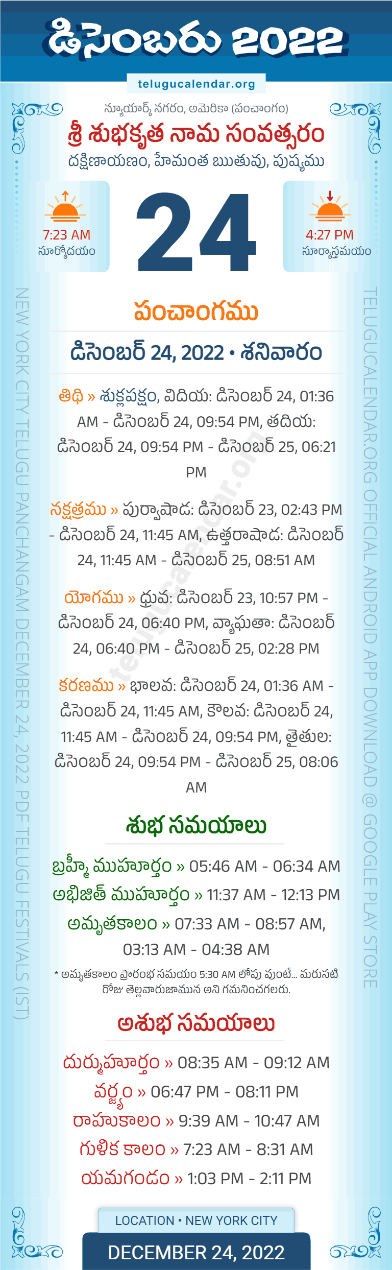 December 24, 2022 Subha Muhurthalu (IST)Telugu Panchangam 2022 Daily Calendar Sheet for New York (USA) showing information about the 5 attributes of the day, viz., Nakshatram, Tithi, Varam, Yogam & Karanam along with starting and end timings. Apart from the Panchangam, you can also find the Sunrise and Sunset timings, Paksham, Telugu Year, Yanam, Rutuvu, Telugu Month for New York. Auspicious Period 24 December 2022 New York (Today Good Timings like Abhijit Muhurtham, Amruta Kalam & Brahma Muhurtham) and Inauspicious Period 24 December 2022 New York (Bad Timings like Rahukalam, Gulika kalam, Yamagandam, Durmuhurtham & Varjyam) with starting and end timings.