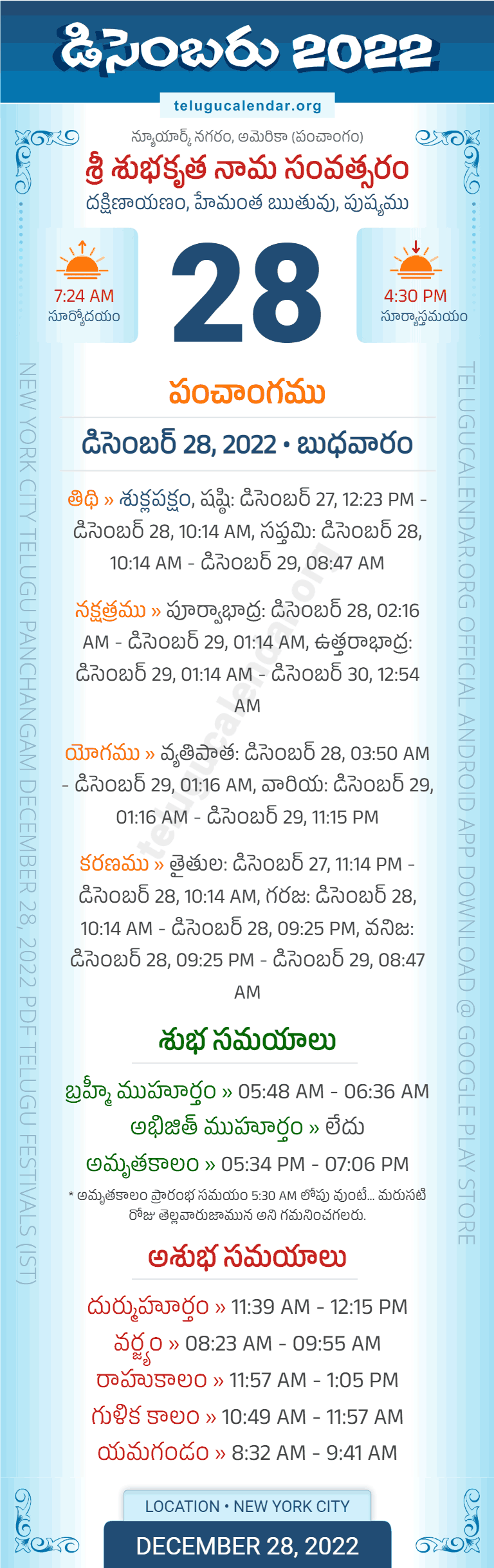 December 28, 2022 Subha Muhurthalu (IST)Telugu Panchangam 2022 Daily Calendar Sheet for New York (USA) showing information about the 5 attributes of the day, viz., Nakshatram, Tithi, Varam, Yogam & Karanam along with starting and end timings. Apart from the Panchangam, you can also find the Sunrise and Sunset timings, Paksham, Telugu Year, Yanam, Rutuvu, Telugu Month for New York. Auspicious Period 28 December 2022 New York (Today Good Timings like Abhijit Muhurtham, Amruta Kalam & Brahma Muhurtham) and Inauspicious Period 28 December 2022 New York (Bad Timings like Rahukalam, Gulika kalam, Yamagandam, Durmuhurtham & Varjyam) with starting and end timings.