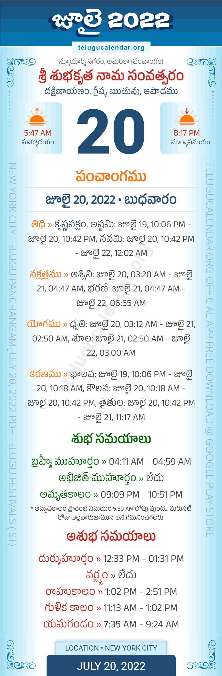 July 20, 2022 Subha Muhurthalu (IST)Telugu Panchangam 2022 Daily Calendar Sheet for New York (USA) showing information about the 5 attributes of the day, viz., Nakshatram, Tithi, Varam, Yogam & Karanam along with starting and end timings. Apart from the Panchangam, you can also find the Sunrise and Sunset timings, Paksham, Telugu Year, Yanam, Rutuvu, Telugu Month for New York. Auspicious Period 20 July 2022 New York (Today Good Timings like Abhijit Muhurtham, Amruta Kalam & Brahma Muhurtham) and Inauspicious Period 20 July 2022 New York (Bad Timings like Rahukalam, Gulika kalam, Yamagandam, Durmuhurtham & Varjyam) with starting and end timings.