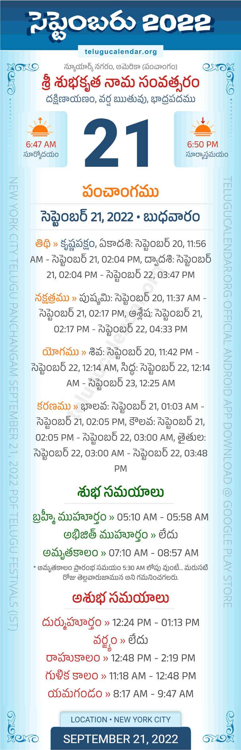 September 21, 2022 Subha Muhurthalu (IST)Telugu Panchangam 2022 Daily Calendar Sheet for New York (USA) showing information about the 5 attributes of the day, viz., Nakshatram, Tithi, Varam, Yogam & Karanam along with starting and end timings. Apart from the Panchangam, you can also find the Sunrise and Sunset timings, Paksham, Telugu Year, Yanam, Rutuvu, Telugu Month for New York. Auspicious Period 21 September 2022 New York (Today Good Timings like Abhijit Muhurtham, Amruta Kalam & Brahma Muhurtham) and Inauspicious Period 21 September 2022 New York (Bad Timings like Rahukalam, Gulika kalam, Yamagandam, Durmuhurtham & Varjyam) with starting and end timings.