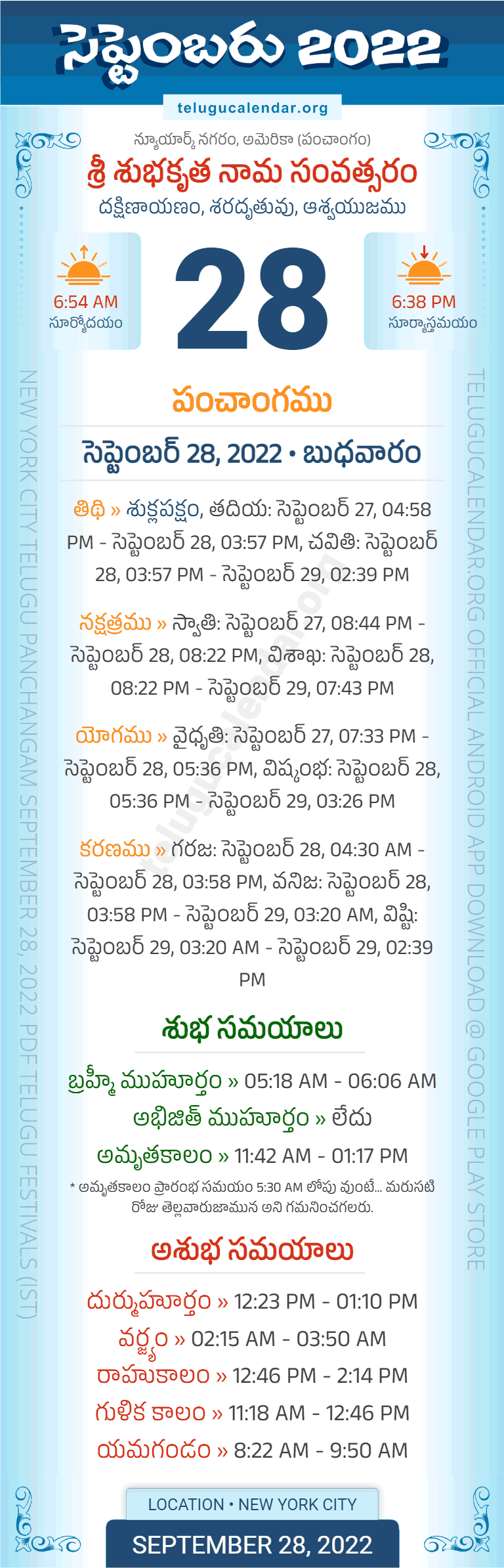 September 28, 2022 Subha Muhurthalu (IST)Telugu Panchangam 2022 Daily Calendar Sheet for New York (USA) showing information about the 5 attributes of the day, viz., Nakshatram, Tithi, Varam, Yogam & Karanam along with starting and end timings. Apart from the Panchangam, you can also find the Sunrise and Sunset timings, Paksham, Telugu Year, Yanam, Rutuvu, Telugu Month for New York. Auspicious Period 28 September 2022 New York (Today Good Timings like Abhijit Muhurtham, Amruta Kalam & Brahma Muhurtham) and Inauspicious Period 28 September 2022 New York (Bad Timings like Rahukalam, Gulika kalam, Yamagandam, Durmuhurtham & Varjyam) with starting and end timings.