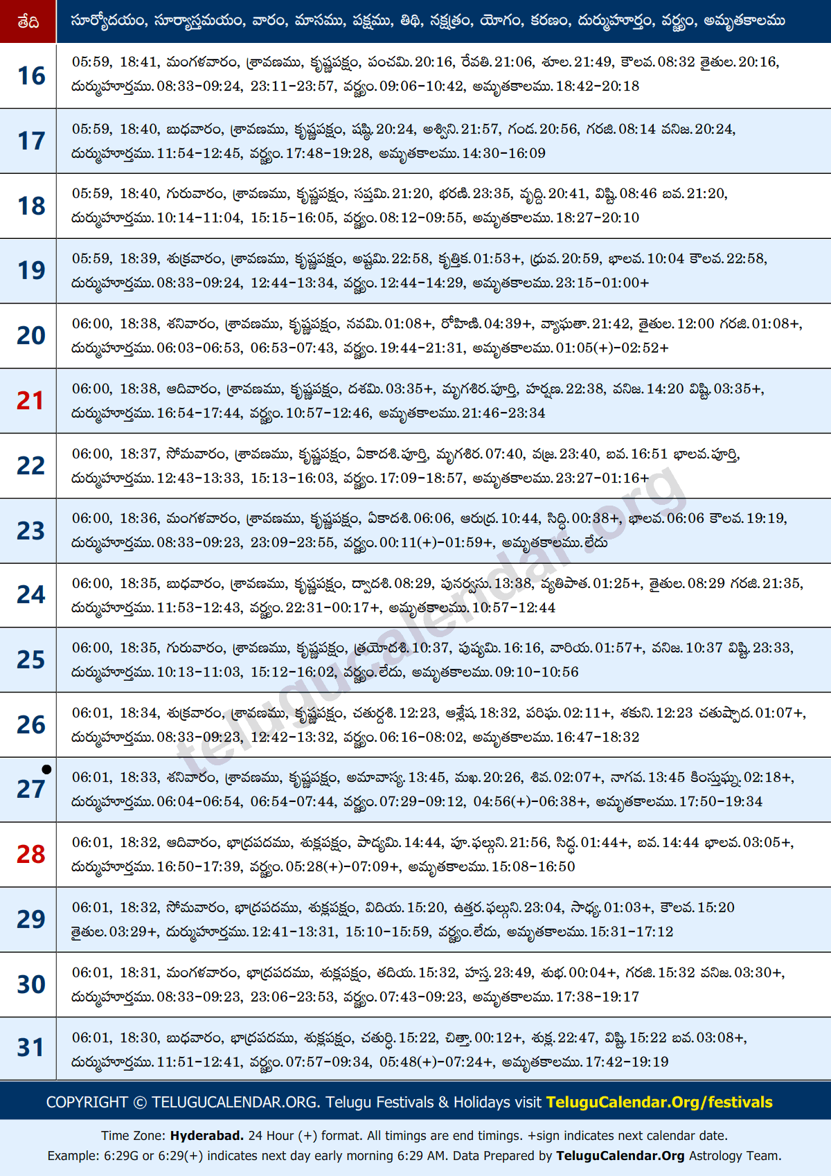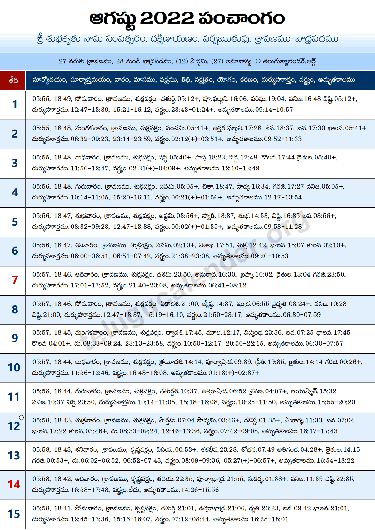 Panchangam 2022 August PDF in Telugu (Shravanamu - Bhadrapadamu) with Pournami & Amavasya.