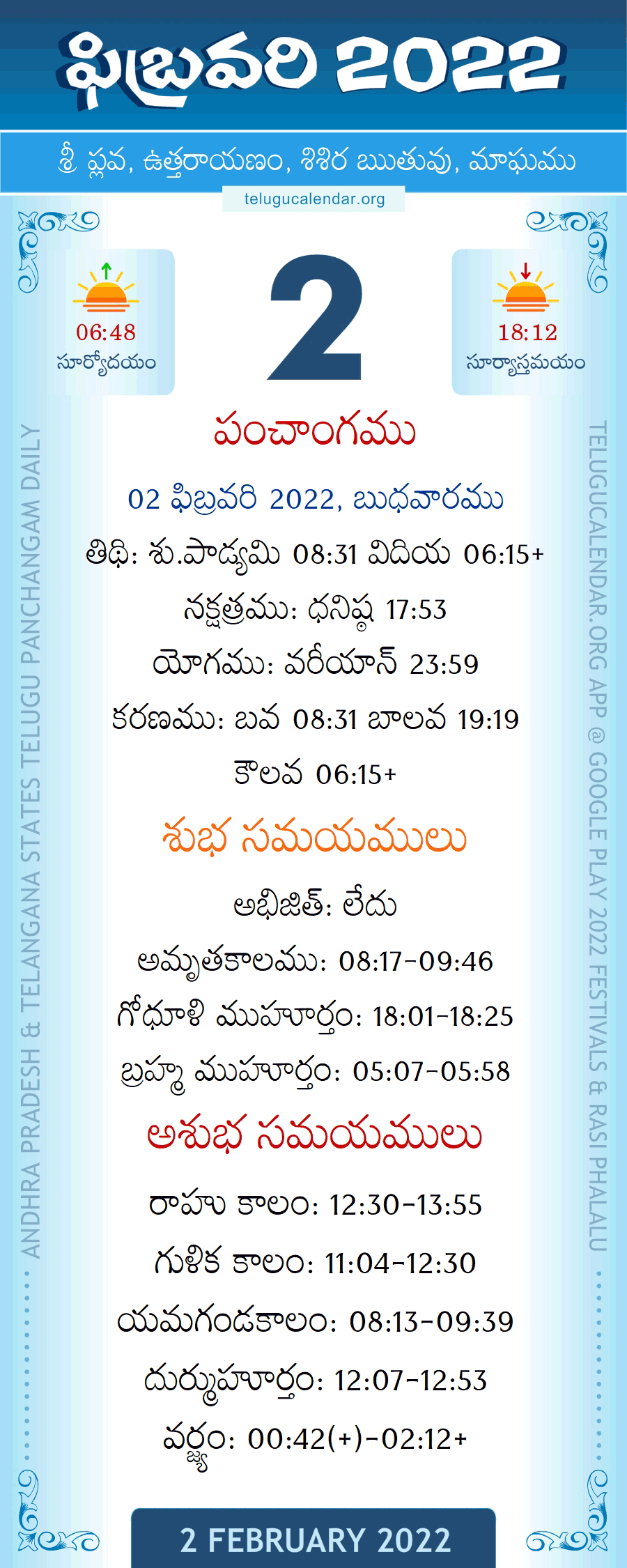 February 2, 2022 Panchangam Telugu Calendar Daily. Sri Plava Nama Samvatsaram, Uttarayanam, Sisira Rutuvu, Magha Masam.