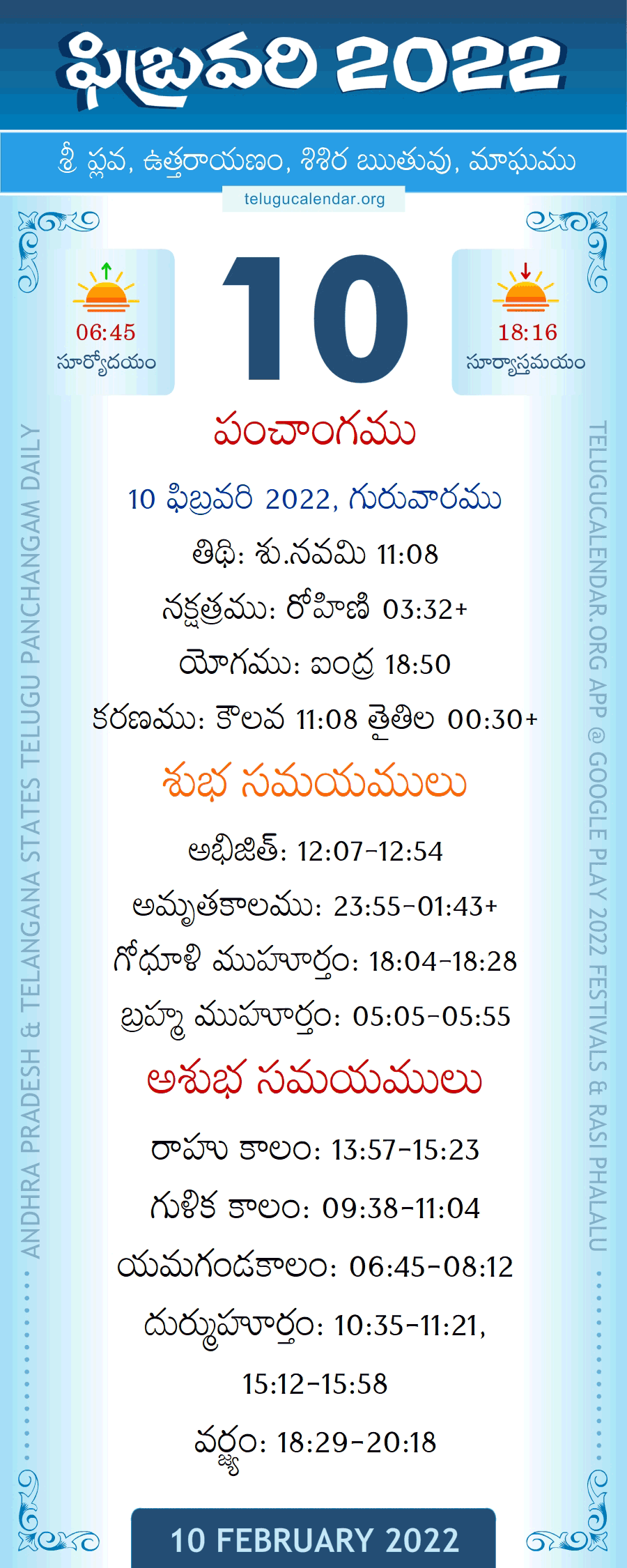 February 10, 2022 Panchangam Telugu Calendar Daily. Sri Plava Nama Samvatsaram, Uttarayanam, Sisira Rutuvu, Magha Masam.
