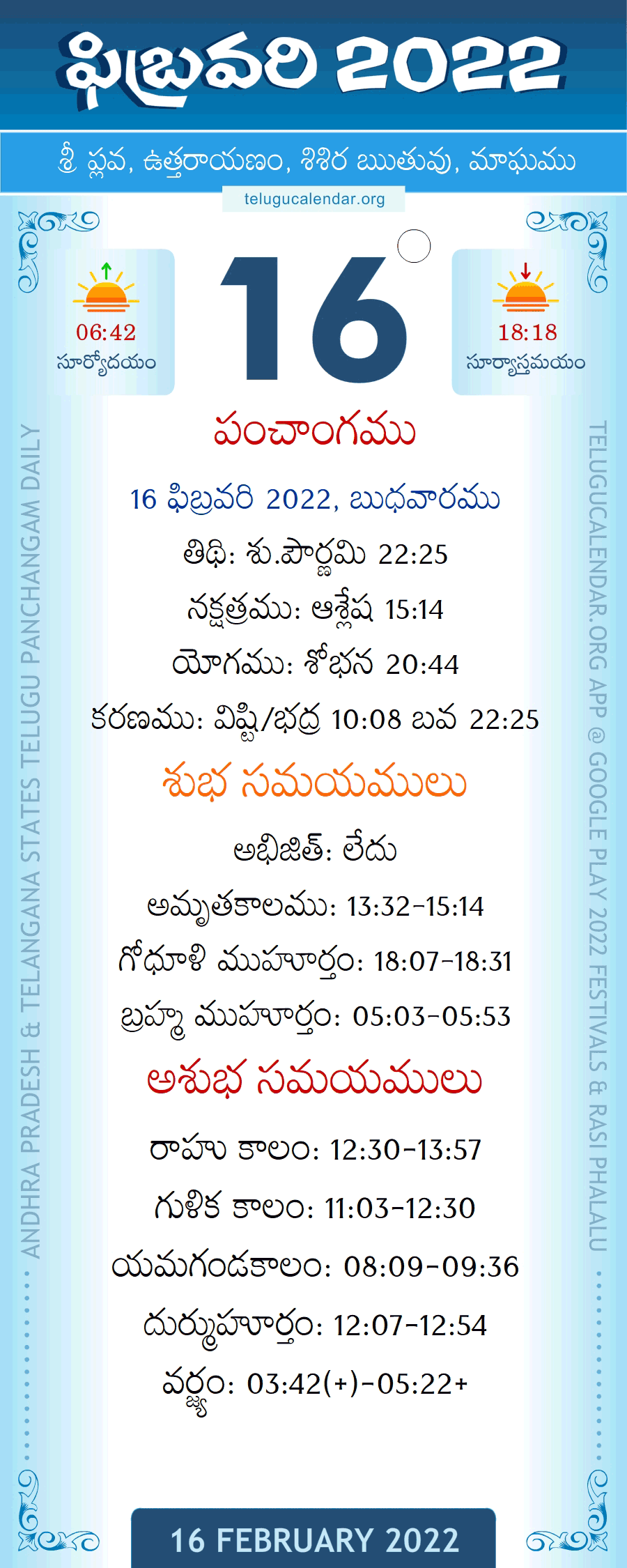 February 16, 2022 Panchangam Telugu Calendar Daily. Sri Plava Nama Samvatsaram, Uttarayanam, Sisira Rutuvu, Magha Masam.