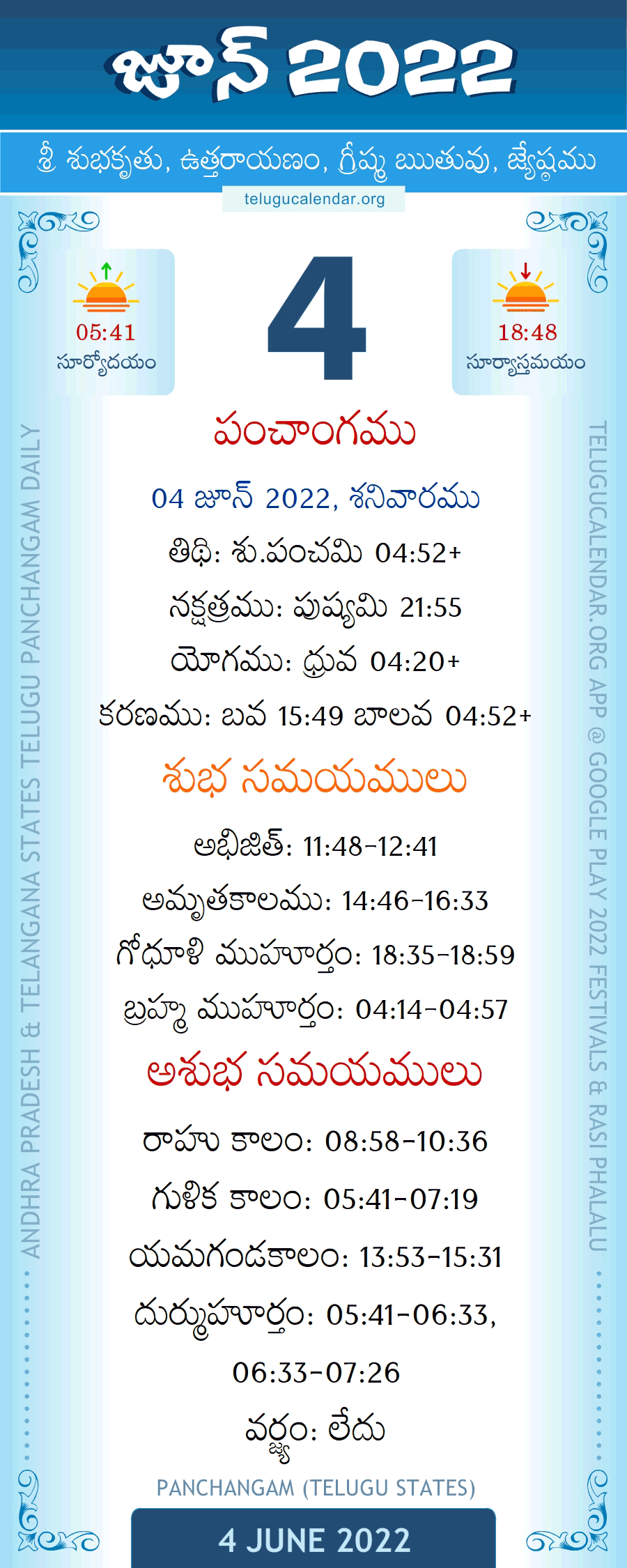 June 4, 2022 Panchangam Telugu Calendar Daily with Festivals, Subha Samayalu, Asubha Samayalu Timings & Telugu Subha Muhurtham Dates.