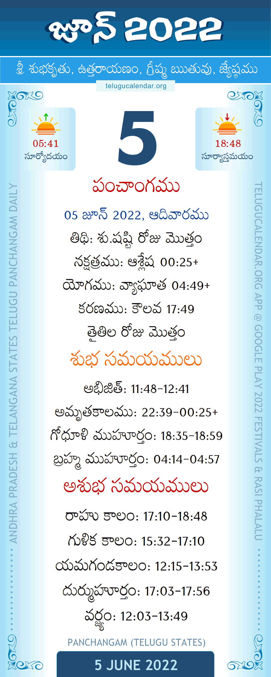 June 5, 2022 Panchangam Telugu Calendar Daily with Festivals, Subha Samayalu, Asubha Samayalu Timings & Telugu Subha Muhurtham Dates.