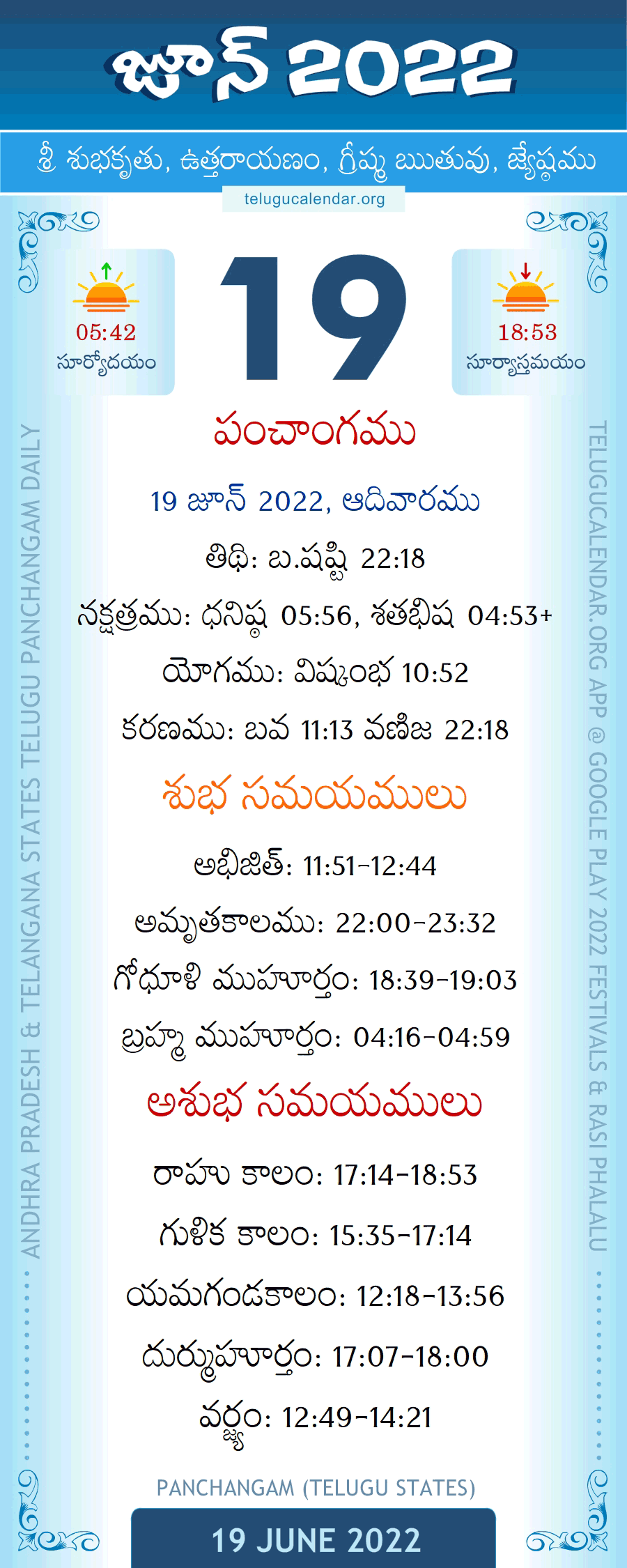 June 19, 2022 Panchangam Telugu Calendar Daily with Festivals, Subha Samayalu, Asubha Samayalu Timings & Telugu Subha Muhurtham Dates.