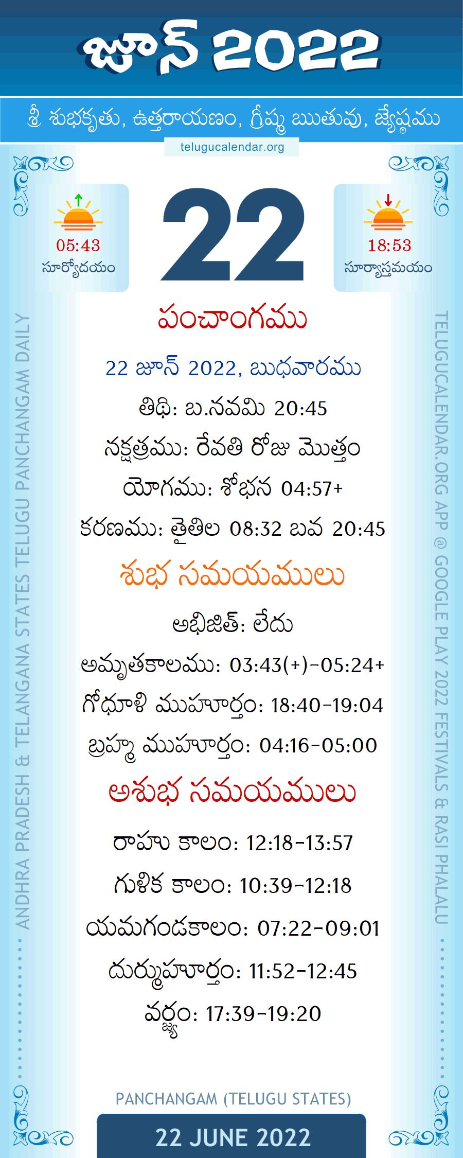 June 22, 2022 Panchangam Telugu Calendar Daily with Festivals, Subha Samayalu, Asubha Samayalu Timings & Telugu Subha Muhurtham Dates.