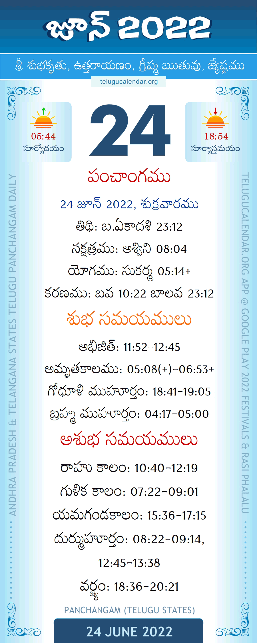 June 24, 2022 Panchangam Telugu Calendar Daily with Festivals, Subha Samayalu, Asubha Samayalu Timings & Telugu Subha Muhurtham Dates.