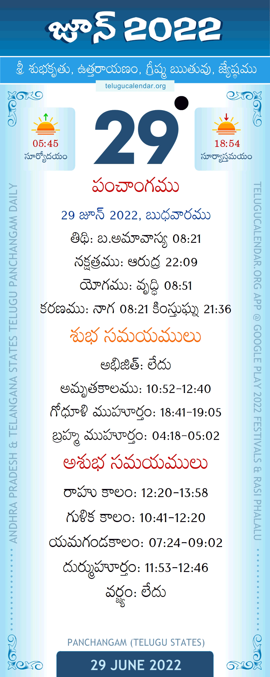 June 29, 2022 Panchangam Telugu Calendar Daily with Festivals, Subha Samayalu, Asubha Samayalu Timings & Telugu Subha Muhurtham Dates.