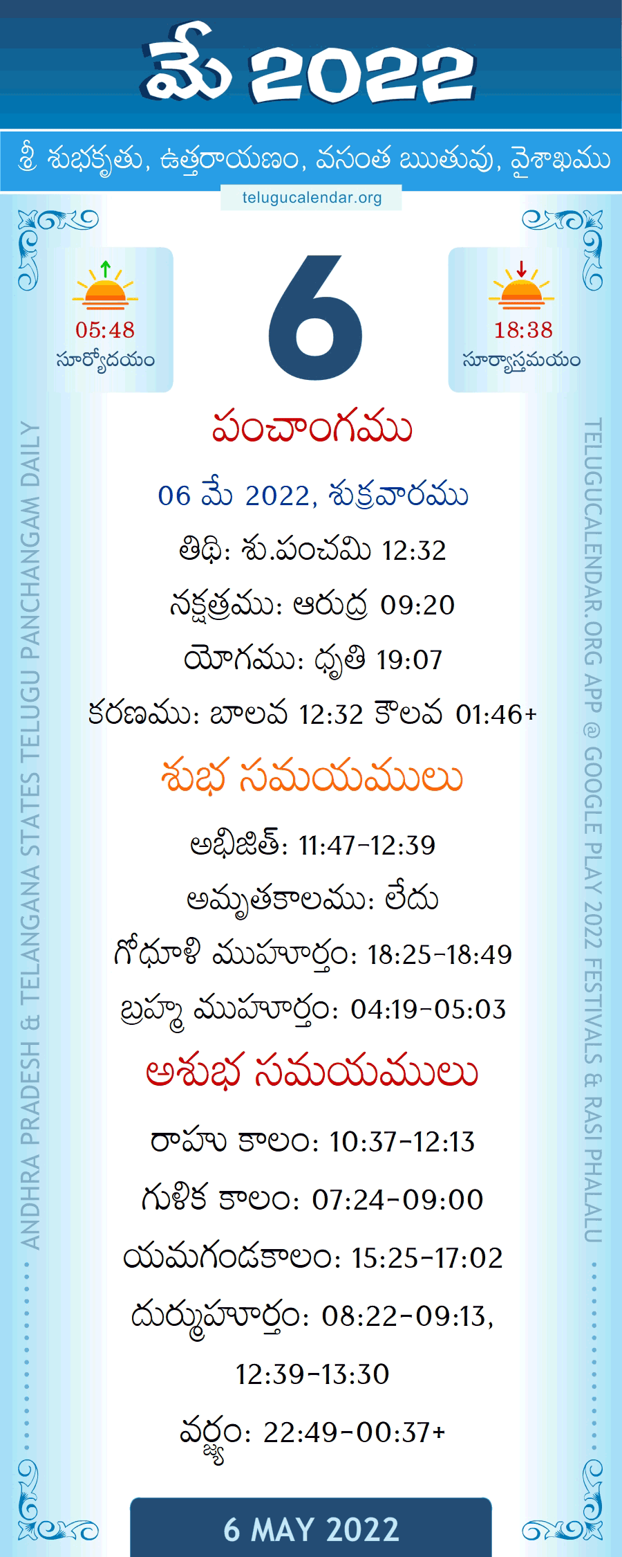 May 6, 2022 Subha MuhurthamToday's Telugu Panchangam for Telugu States.