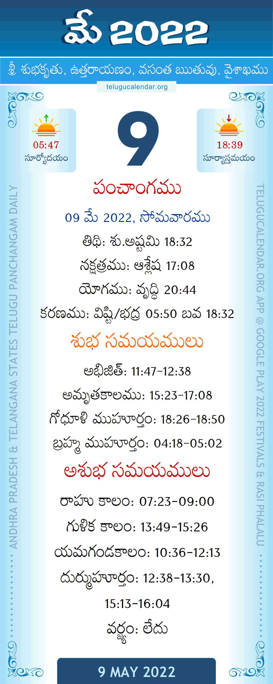 May 9, 2022 Subha MuhurthamToday's Telugu Panchangam for Telugu States.