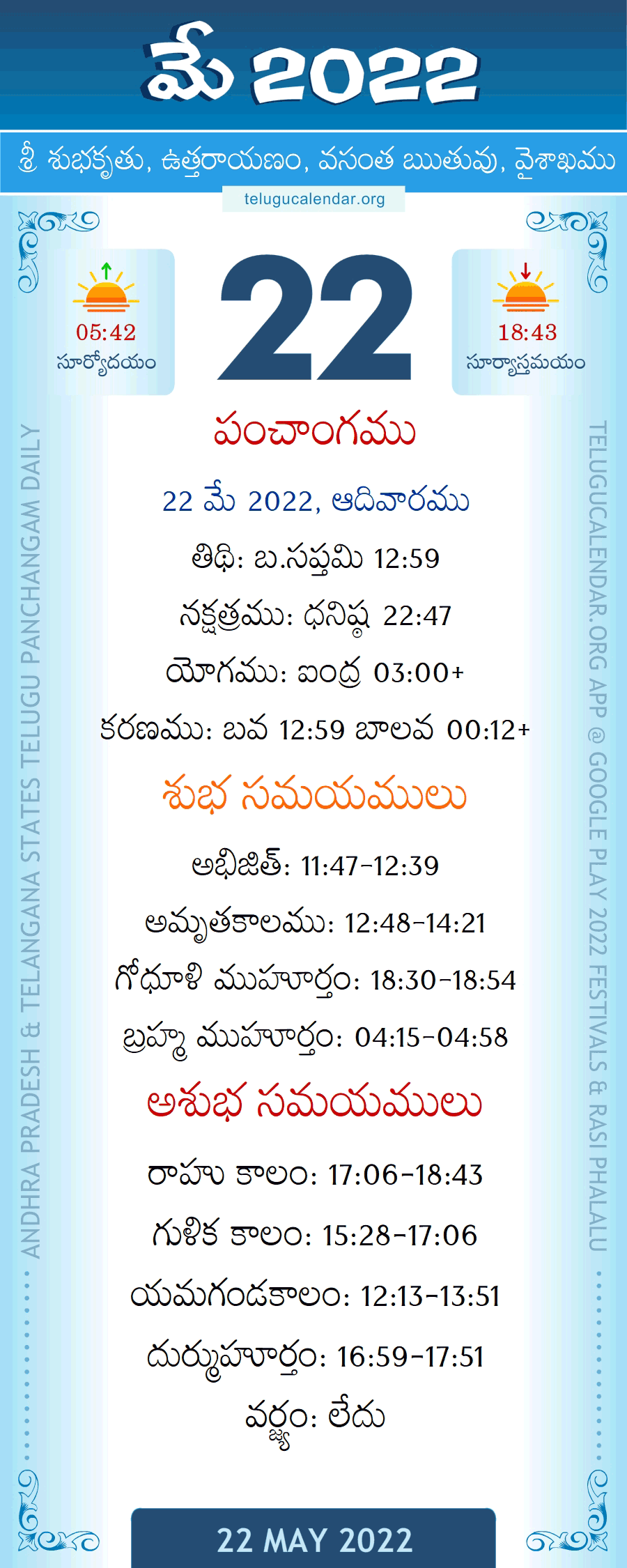 May 22, 2022 Subha MuhurthamToday's Telugu Panchangam for Telugu States.