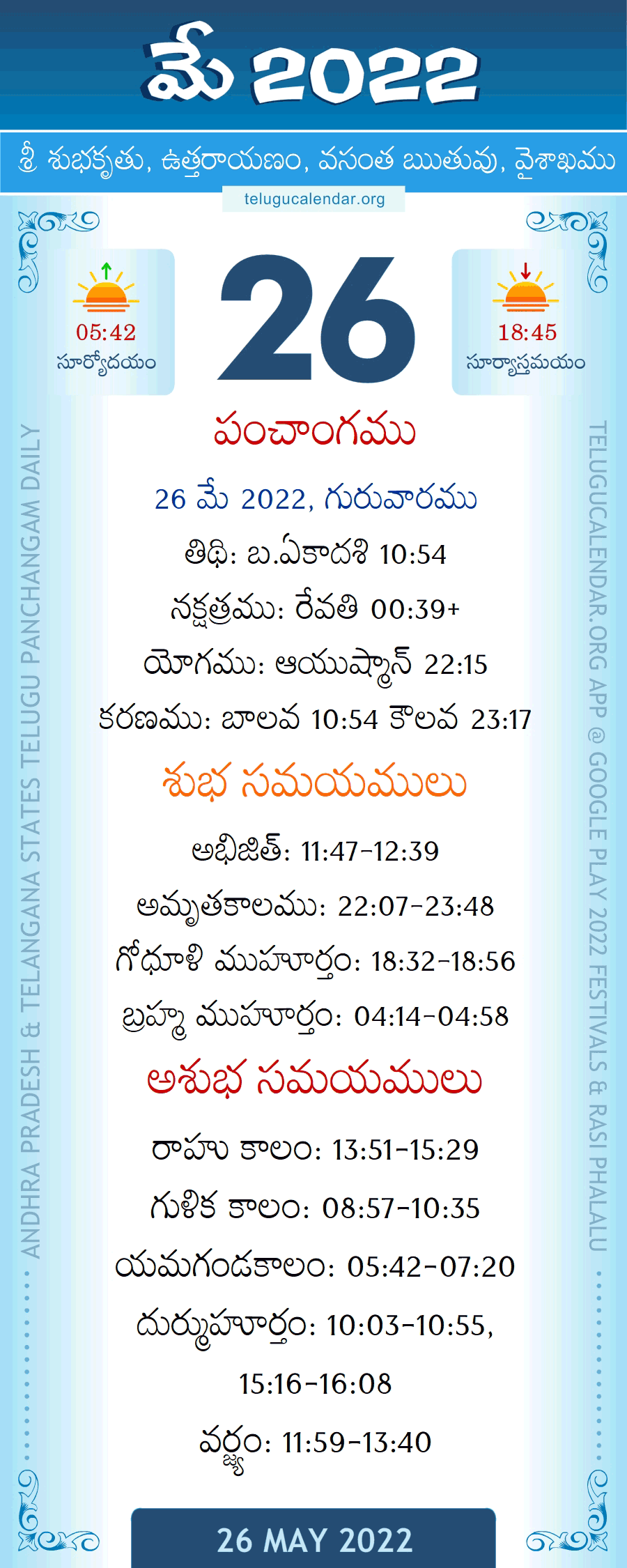 May 26, 2022 Subha MuhurthamToday's Telugu Panchangam for Telugu States.