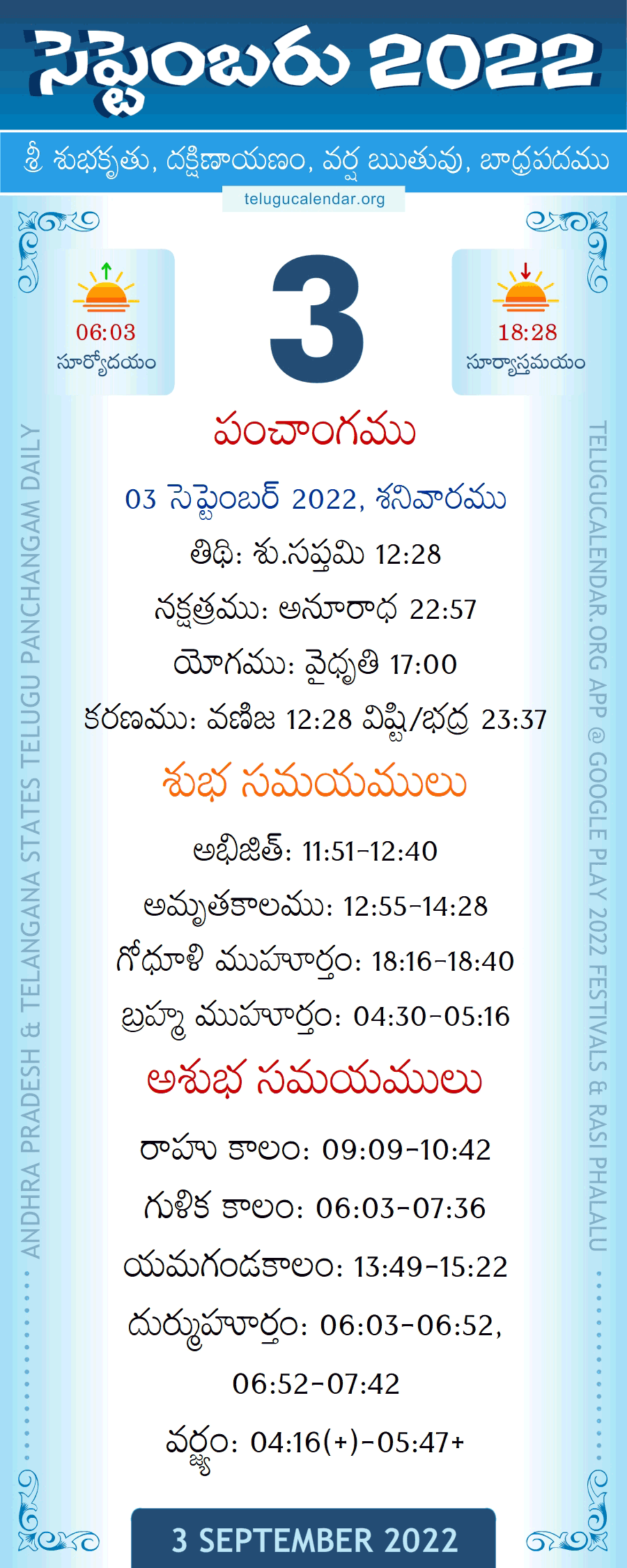 September 3, 2022 Panchangam Telugu Calendar Daily with Festivals, Subha Samayalu and Asubha Samayalu Timings.