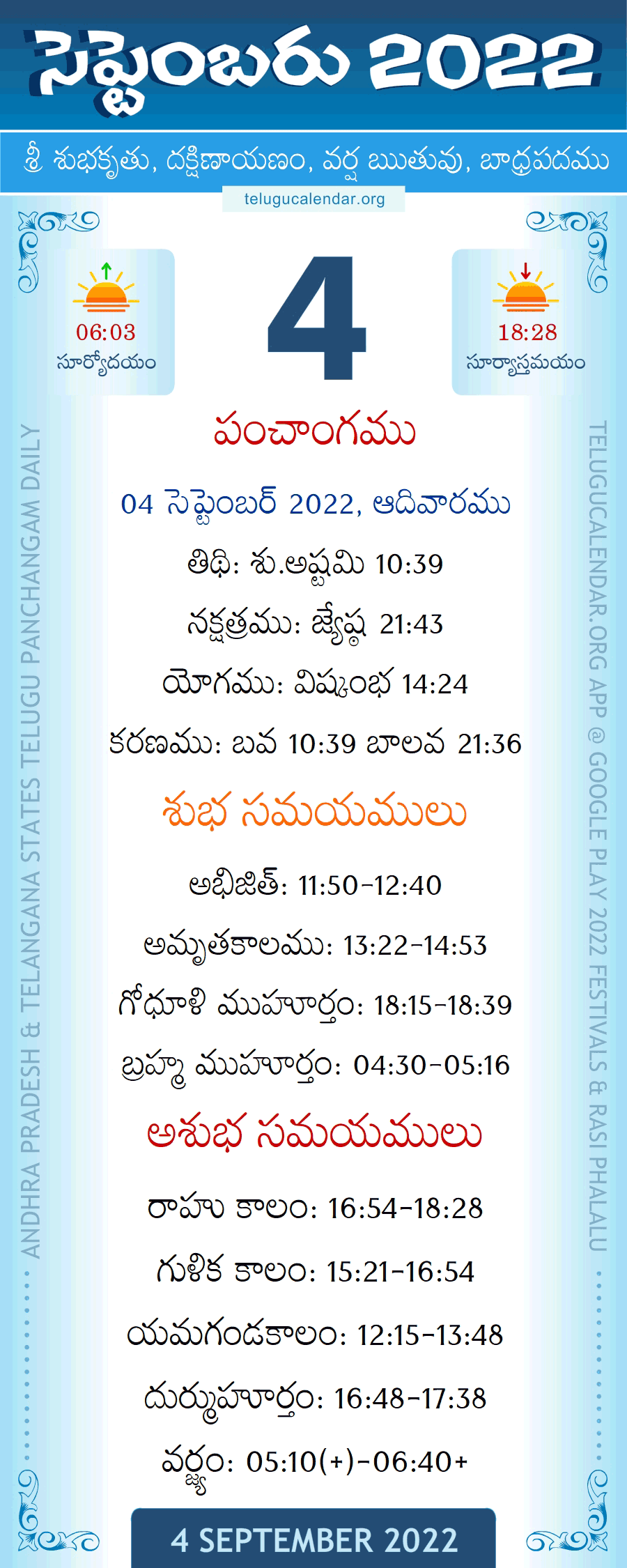 September 4, 2022 Panchangam Telugu Calendar Daily with Festivals, Subha Samayalu and Asubha Samayalu Timings.