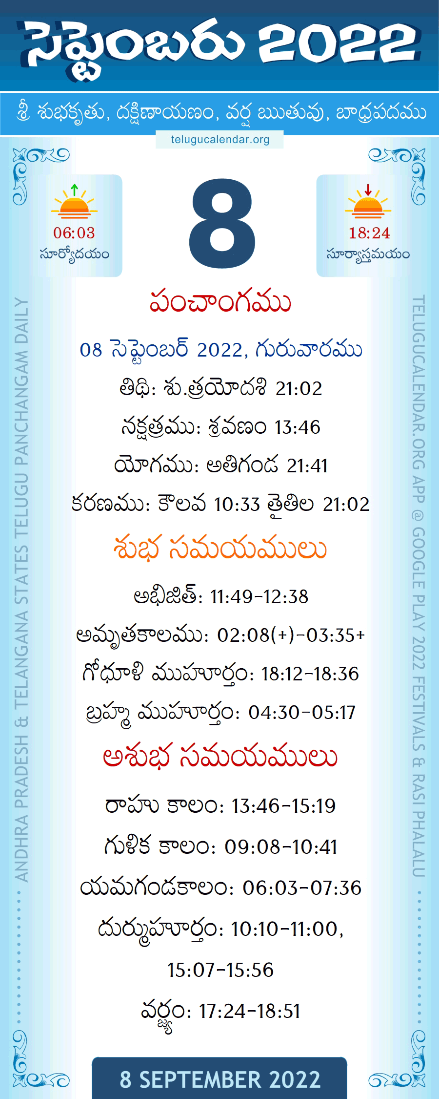 September 8, 2022 Panchangam Telugu Calendar Daily with Festivals, Subha Samayalu and Asubha Samayalu Timings.