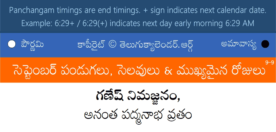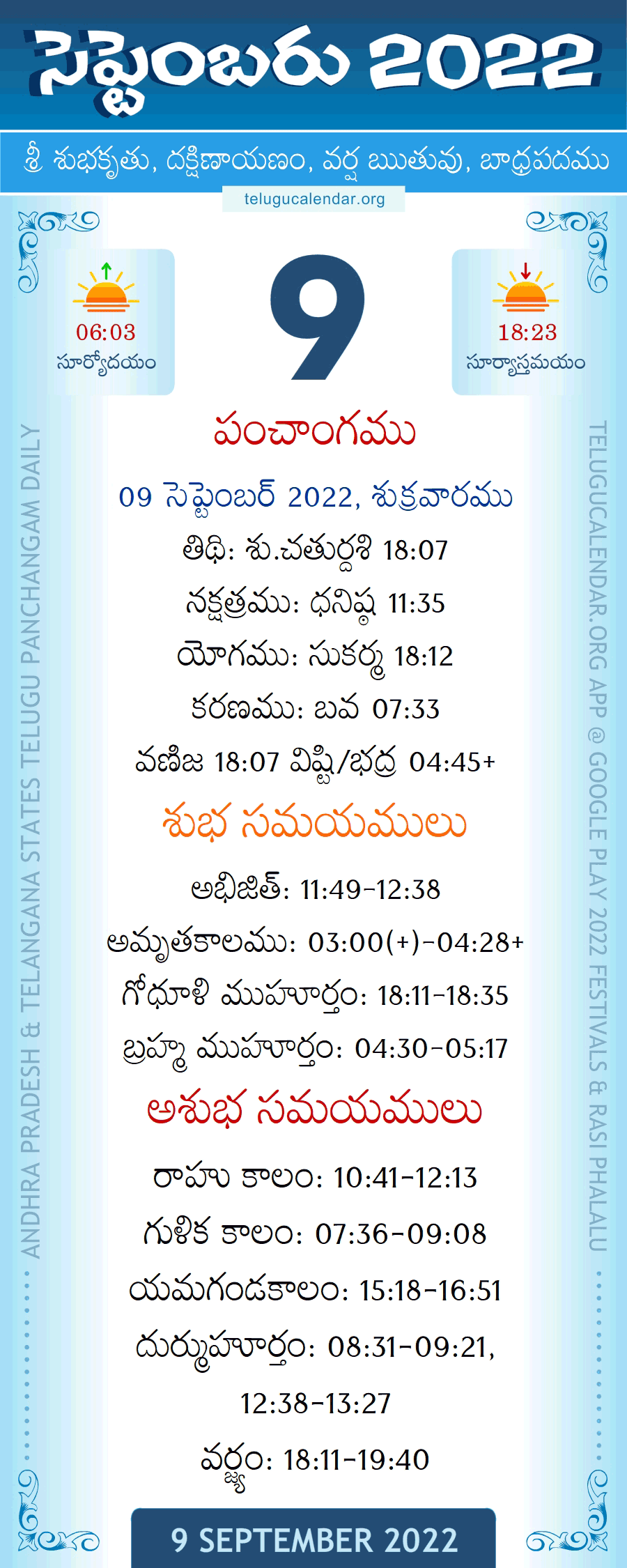September 9, 2022 Panchangam Telugu Calendar Daily with Festivals, Subha Samayalu and Asubha Samayalu Timings.